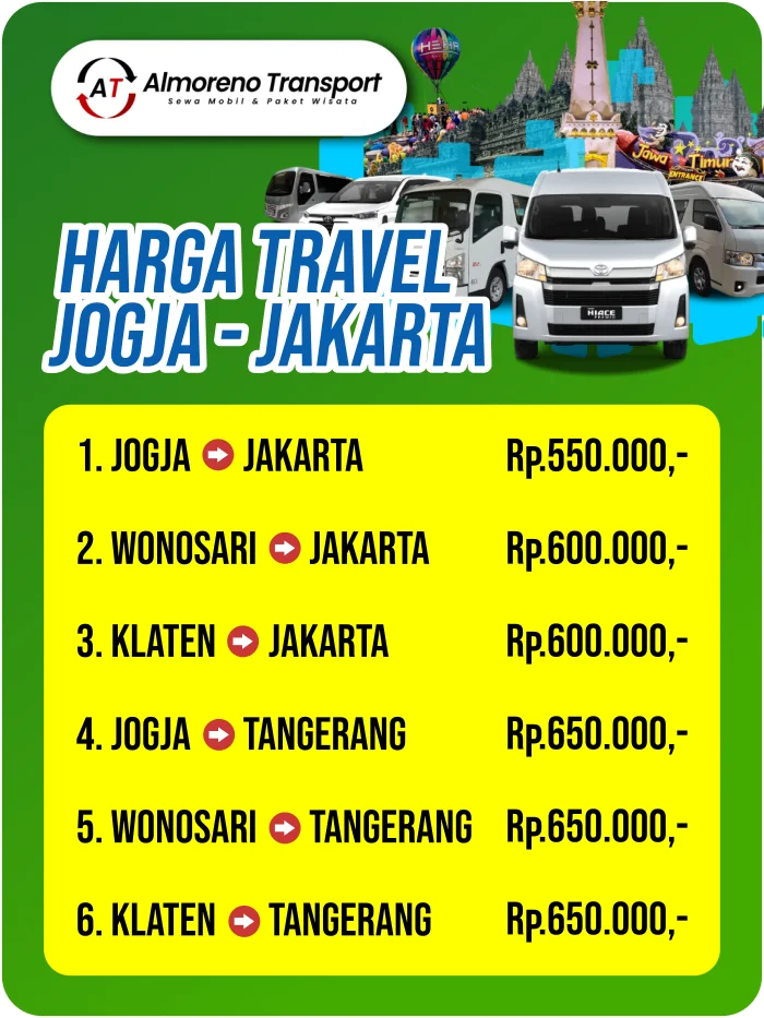 Ingin bepergian dari Yogyakarta ke Jakarta dengan cara yang praktis dan hemat waktu? Almoreno Tour & Travel siap menemani perjalanan Anda dengan layanan travel antar jemput (door to door) dari Wonosari, Klaten, dan Yogyakarta menuju Jakarta, Bogor, dan Tangerang, serta kota-kota yang dilewati seperti Karawang, Cikampek, Bekasi, dan Cirebon.